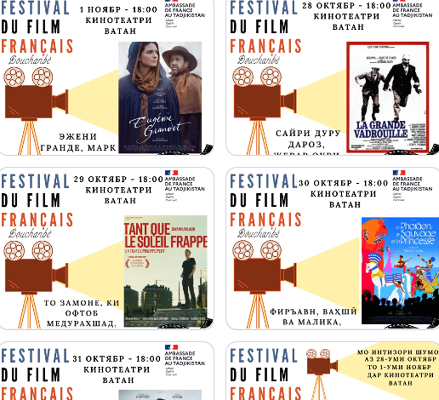 Аз 28-уми октябр то 1-уми ноябр дар кинотеатри «Ватан» дар Душанбе Ҷашнвораи филмҳои фаронсавӣ баргузор мешавад.
