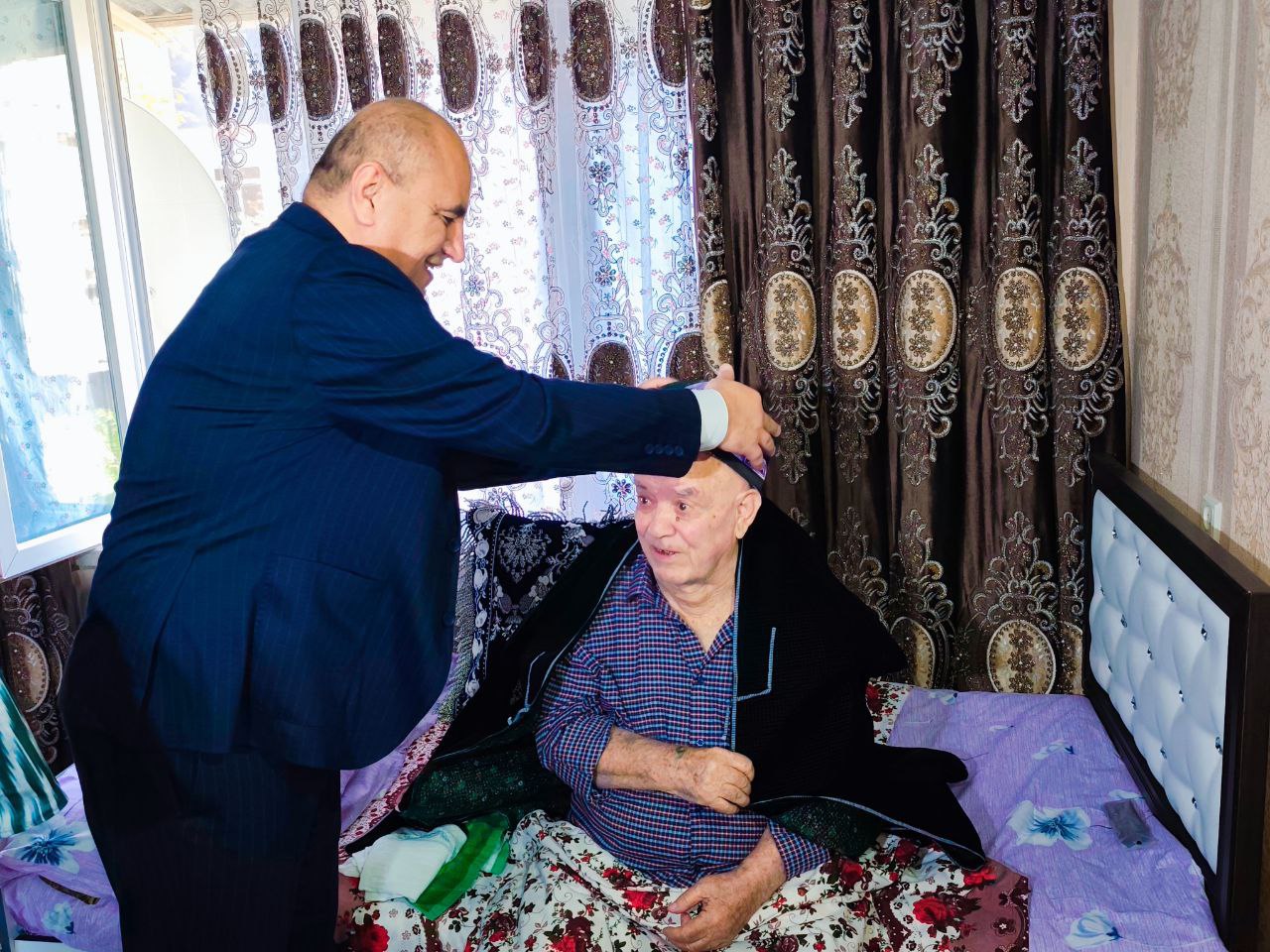 Раиси шаҳр ҳамчунин рамзи эҳтиром ба Назрулло Амруллоев, ки 60 сол собиқаи омӯзгорӣ дорад ҷома пӯшонид.