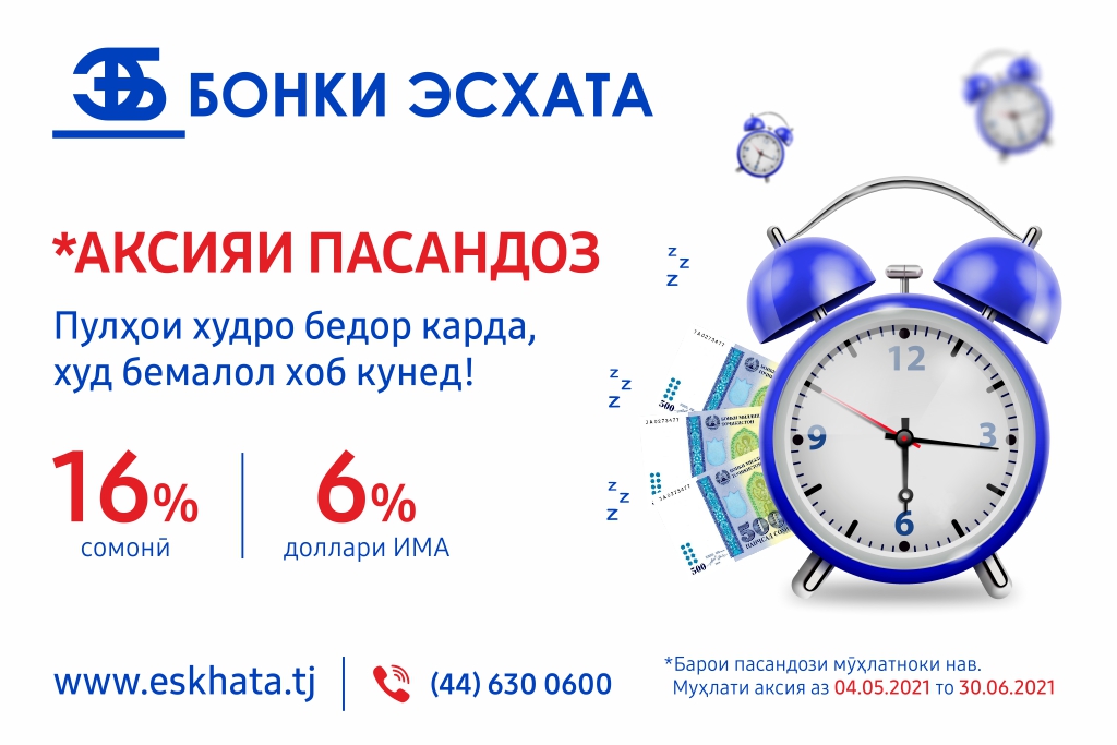 Қайд кардан бамаврид аст, ки иқдоми мазкур аз 4-уми май оғоз гардидааст ва то 30-юми июни соли ҷорӣ идома меёбад. Маълумоти муфассалро бо рақами (44) 630 06 00 ё дар сомонаи расмии бонк дастрас созед: https://www.eskhata.com/tj/individuals/deposit/deposit_types_new.php