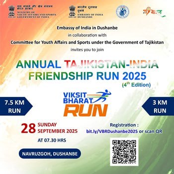 Дар шаҳри Душанбе бо ташаббуси Сафорати Ҳиндустон дар Ҷумҳурии Тоҷикистон дар ҳамкорӣ бо Кумитаи кор бо ҷавонон ва варзиш ва Мақомоти иҷроияи ҳокимияти давлатии шаҳри Душанбе бахшида ба 33-солагии ба роҳ мондани муносибатҳои дипломатӣ байни Ҷумҳурии Тоҷикистон ва Ҷумҳурии Ҳиндустон Дави чоруми солонаи дӯстии Тоҷикистон-Ҳиндустон-2025 ва Дави «Виксит Бҳарат» баргузор мешавад. Мусобиқаи «Дави дӯстӣ» 28 сентябр, соати 07:30 дар «Наврӯзгоҳ»-и Душанбе баргузор хоҳад шуд. Дар ин бора аз Сафорати Ҳиндустон дар Тоҷикистон хабар доданд.