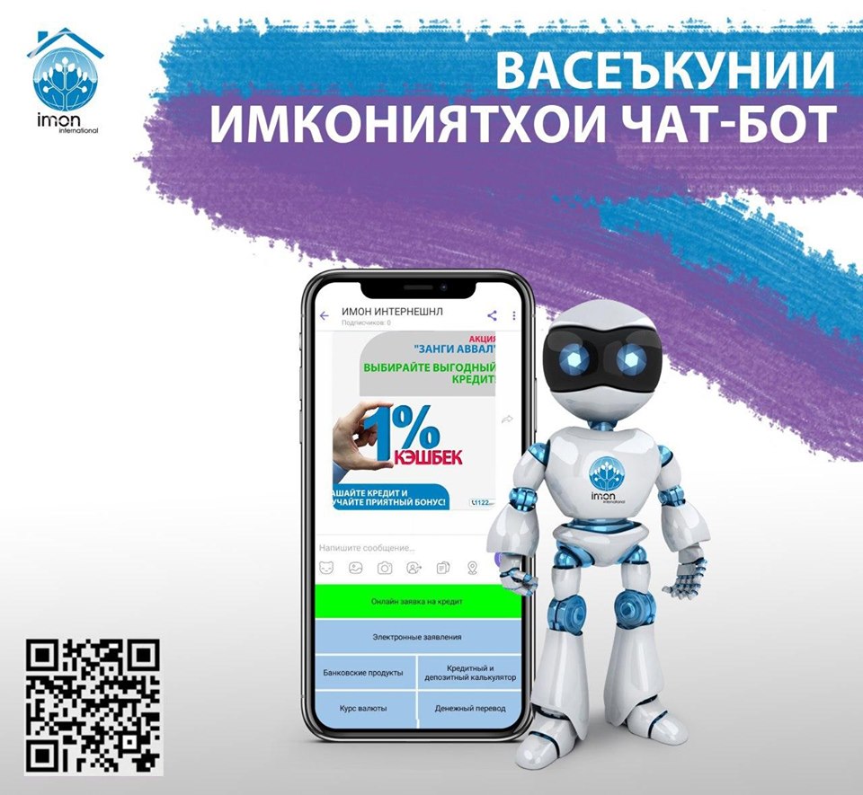Мавриди зикр аст, ки барои гирифтани қарз ба шаҳрвандон лозим нест, ки ба офисҳои бонк муроҷиат карда интизори расидани навбати худ шаванд, акнун муштариён метавонанд аз мутахассисони қарзӣ маслиҳати пешакӣ гиранд! Барои ин амалиётро иҷро кардан муштариён метавонанд, аз тариқисмартфонпаёмакҳои худро ирсол намоянд:Масаланд тариқи Viber ё Telegram. Ҳангоми ҷустуҷӯ шумо бояд пурсед: IMON BOT.