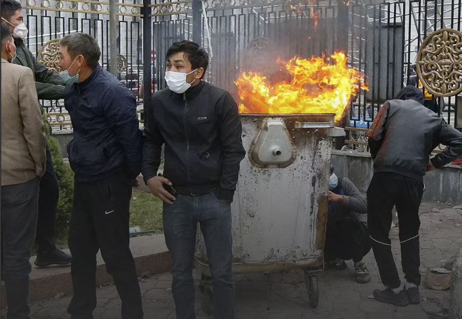 Дар моҳи июл марг аз COVID-19 якбора афзоиш ёфт, аммо омори расмӣ дар бораи шумораи фавтҳо хомӯш буд. Системаи тандурустӣ ба омадани беморон тоб оварда натавонист. Дар дорухонаҳо гирифтани доруҳо ғайриимкон буд. Мақомот карантинро шадидтар карданд, аммо ин фоида надод. Масъулин масъулиятро барои вазъи ногувори тиб ба якдигар вогузор карданд. Рейтинги Жээнбеков босуръат паст мешуд. Аммо президент бовар надошт, ки пандемия нақшаҳои ӯро вайрон карда метавонад. Гузашта аз ин, ҳама чиз барои интихоботи 4-уми октябр омода буд ва пирӯзии вакилони содиқ ба ӯ, баръакс, ба тақвияти қудрати ӯ ваъда дод. Аммо баробари маълум шудани натиҷаҳои интихобот, эътирозҳо Бишкекро фаро гирифтанд. Мардум бовар карданро рад карданд, ки ҳизбҳои маъруфи тарафдори ҳукумат Биримлик ва Мекеним Қирғизистон аксарияти парлумонро ба даст меоранд. Аъзои Комиссияи марказии интихобот ба қаллобии азим муттаҳам шуданд ва бекор кардани натиҷаҳоро талаб карданд. 686 нафар ҳангоми бетартибиҳо дар Бишкек зарар диданд. Дар зери фишори эътирозгарон мақомот ақибнишинӣ карданд. Натиҷаҳои интихобот бекор карда шуданд. Жээнбеков истеъфо дод. Содир Ҷапаров, сарвазири собиқ, ки барои қаллобии молиявӣ адои ҷазо мекард, мақоми президентро гирифт. Ҳангоми тазоҳурот тазоҳургарон ба боздоштгоҳи муваққатӣ даромада, ӯро раҳо карданд. Ҷапаров соли 2005 вориди сиёсати калон шуд ва қабл аз он бо тиҷорат машғул буд. Мақомот ӯро дар пардохт накардани андоз ба ҳайси директори корхонаи коркарди нафти «Нурнефтегаз» айбдор карданд.
