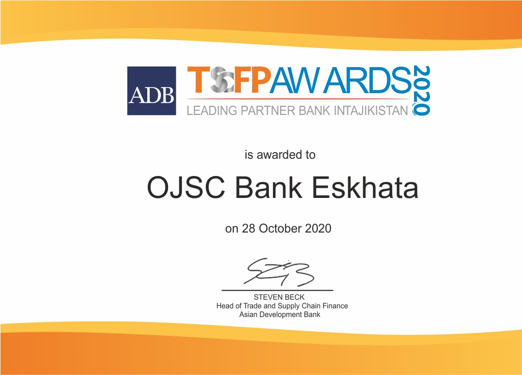 Ин бори дуввум аст, ки ҶСК “Бонки Эсхата” дар доираи барномаи TSCFP “Бонки шарики пешбари Тоҷикистон дар соли 2019” пешбарӣ шудааст. Маросими ҷоизасупорӣ барои барномаи Бонки Осиёии Рушд TSCFP 28 октябри соли 2020 онлайн баргузор гардид.