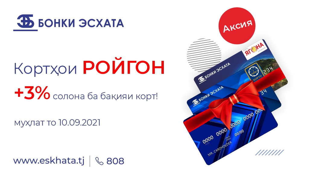 Бале, кортҳо дар Бонки Эсхата ройгонанд! Акнун шумо метавонед Корти Миллӣ, Корти Ягона ва корти локалии Бонки Эсхатаро пурра ройгон гиред! Бояд қайд кард, ки афзалияти дигари кортҳои Бонки Эсхата – ин имконияти зиёд кардани маблағи бақияи корт ба 3% солона мебошад!