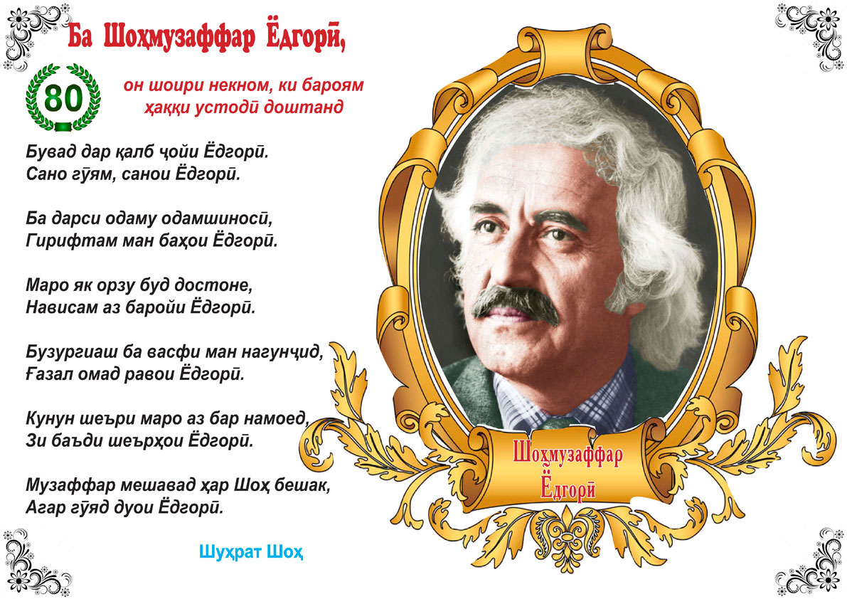 Имрӯз, 22-юми январ, дар бинои Иттифоқи нависандагони Тоҷикистон маҳфили ёдбуди шоири зиндаёди тоҷик Шоҳмузаффр Ёдгорӣ, бахшида ба 80-солагии зодрӯзи ин адиб ва рӯзноманигор, баргузор гардид.