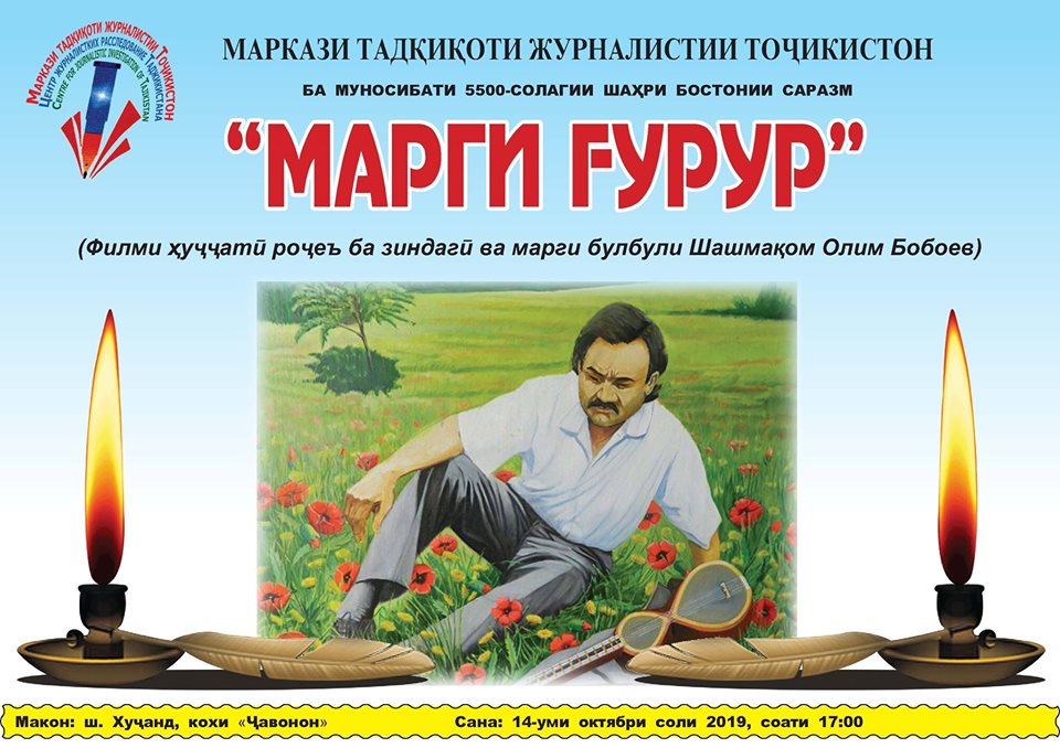 14-уми октябри соли равон дар маркази “Ҷавонон”-и ба номи Лоиқ Шералии шаҳри Хуҷанд филми мустанади “Марги ғурур”, ки аз тарафи Маркази тадқиқоти журналистии Тоҷикистон омода шудааст, бахшида ба 5500-солагии шаҳри Саразми бостон намоиш дода мешавад.