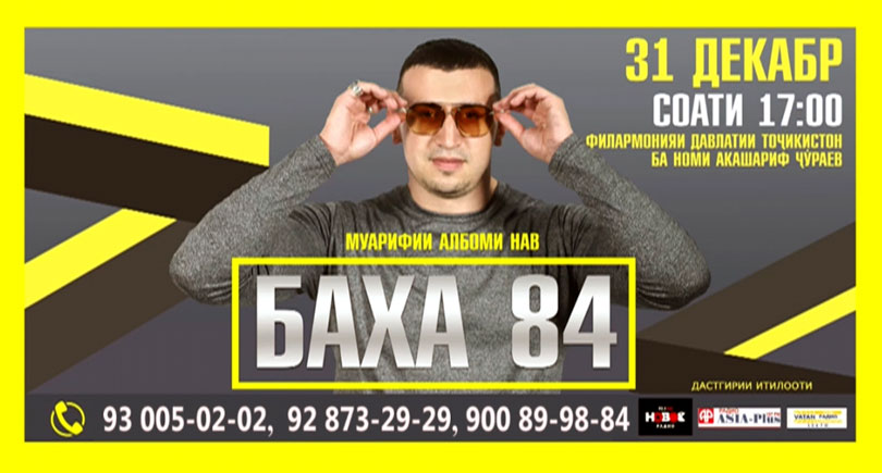 31-уми декабри соли 2019, соати 17:00, муаррифии албоми нави рэпсарои маъруфи тоҷик Баха 84 дар толори Филармонияи давлатии Тоҷикистон ба номи Акашариф Ҷӯраев баргузор мегардад.