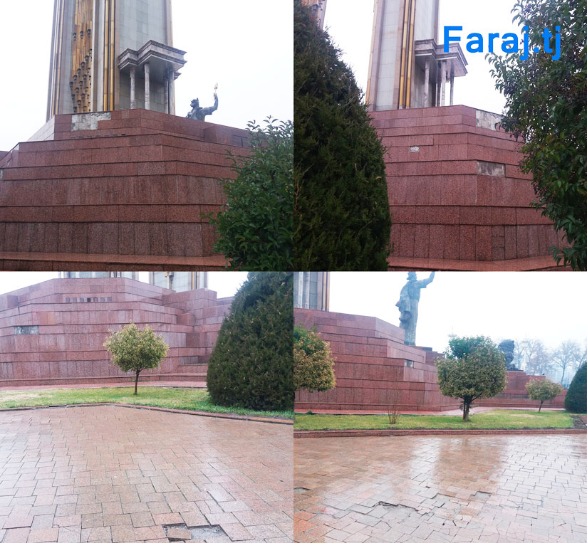 5 санги пояи муҷассама канда шудааст, ранги пайкара то ҷое хиратоб, сафолакҳои майдон рахна гардидааст, ки ба таъмир ниёз доранд.