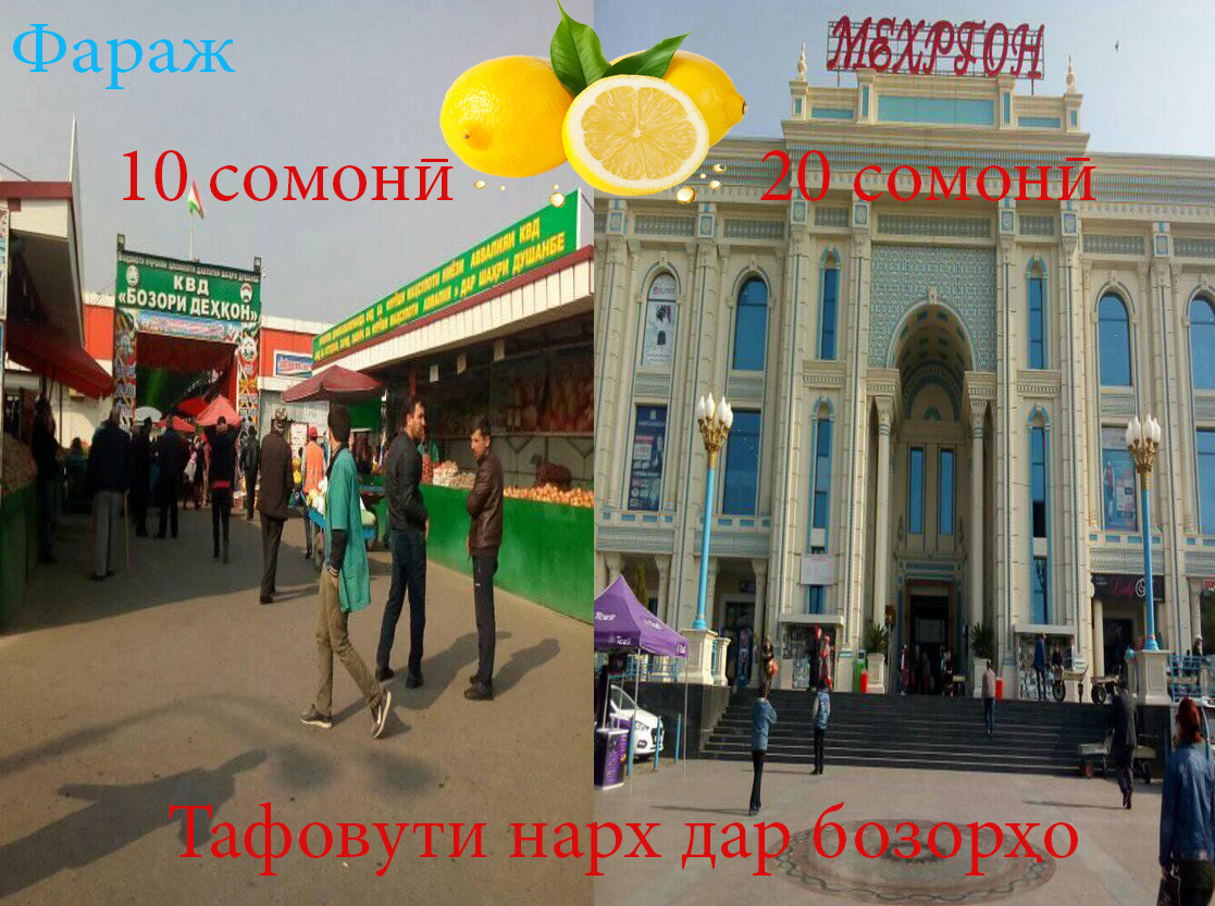 Ё чаро як кило лимӯ дар бозори “Бозори деҳқон” 10 сомониву дар бозори Меҳргон 20 сомонист?