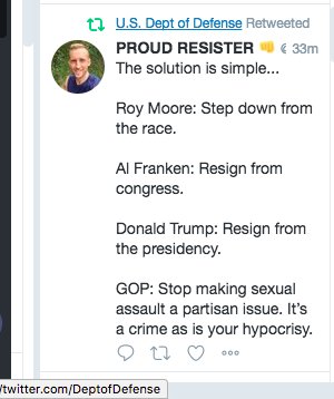 Дар саҳифаи Пентагон бозтвити корбар Proud Resister пайдо шуд, ки Трамп ва сенатори иёлати Миннесот Эл Франкенро ба истеъфо даъват мекард. Ба ғайр аз ин, корбар аз номзади Ҳисби ҷумҳурихоҳон дар сенат аз иёлати Алабама Рой Мур даъват кардааст, ки аз ширкат дар интихобот даст кашад. Франкен ва Мурро ба озору азияти ҷинсӣ гунаҳкор кардаанд.