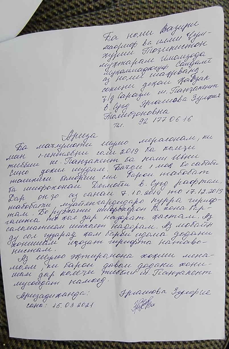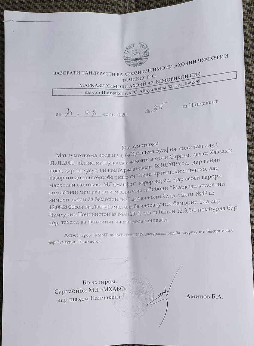 – Ман 1250 сомонӣ маблағи ҳаққи таҳсилро супорида будам ва дар курси аввали ихтисоси кори ҳамширагӣ мехондам. Фикр кардам, ки бо пешниҳод кардани маълумотномаи духтур маро ба хонданам барқарор мекунанд, зеро дар дарс иштирок накарданам сабаби узрнок дошт, Аммо маро барқарор накарданд. Хоҳиш кардам, ки аққалан маро ба рухсатии академӣ гузаронанд, лекин аз коллеҷ гуфтанд, ки барқарор кардан ва таҳсили академӣ гирифтан ба донишҷӯёни курси як роиҷ нест, – мегӯяд Зулфия Эргашева.