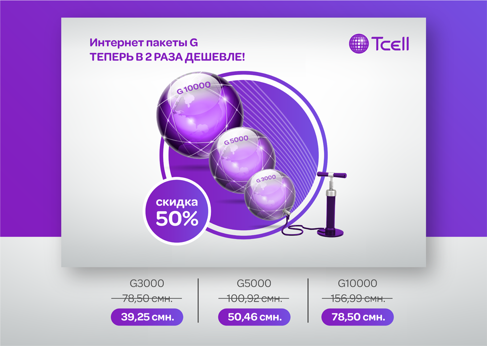 Оператори пешсаф ва навовари кишвар – ширкати Tcell ба муштариён тавсия мекунад, ки аз пешниҳодоти муфиду қулай истифода баранд: опсияҳои G3000, G5000 ва G10000-ро бо тахфифи 50% пайваст кунанд.