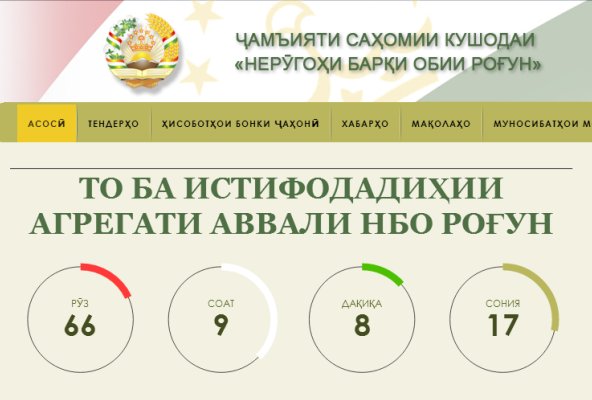 Ҷамъияти саҳомии кушодаи «Неругоҳи барқи обии Роғун» дар вебгоҳи худ соати ҳисоботи мутақобила насб карда кардааст, ки тибқи он то ба истифодадиҳии агрегати аввали НБО «Роғун» 66 рӯз мондааст.