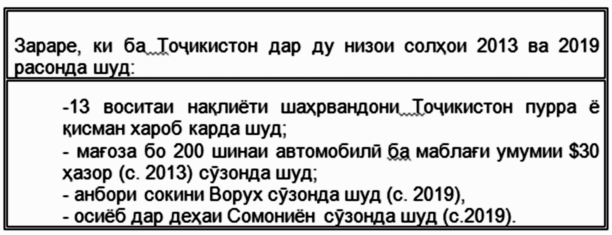 Маблағи зарари умумии шаҳрвандони ҶТ дар ин низоъҳо оварда намешавад.
