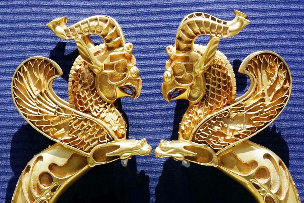 Пайкараҳои заррин ва симини ин ганҷина бозтобдиҳандаи ҳунар ва дониши филизкорӣ дар давраи Ҳахоманишиён мебошад. Тандисҳои дугонаи муъбадон пӯшиши коҳинони баландмартабаро дар рухсори заррин бо резакории тамом ба намоиш кашидаанд.